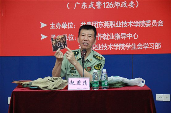 赵政委用风趣幽默的语言向同学们讲诉了自己的学习成长经历和参加对越自卫还击战抗战斗争的岁月,向同学们展示他的各种学习成长证书以及历史见证物品,用自己的故事向同学们阐明了“树立信仰,实现中国梦”的重要性和必要性。赵政委指出,在新时代里依旧要学习雷锋精神,包括雷锋的钉子精神、爱国奉献的螺丝钉精神、助人为乐的傻子精神以及艰苦奋斗的俭约精神,赵政委还提倡同学们努力增强自身的实际操作能力、组织能力和表达能力。