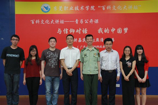 为期一个月的我院第二期“青马工程”培训班已于4月25日正式开始,为了能让我院未参加青马培训的学子感受其魅力,进一步激发我院学子成才报国的热情和责任感,领会中国梦精神内涵,树立信仰,实现中国梦奉献自己的力量,特此联合“百科文化大讲坛”系列讲座于5月5日下午,开展了特别节目——青马公开课。本次讲座由我院团委联合校企合作与就业指导中心共同主办,院学生会学习部承办。为了让学生们更清晰地、更直观地理解“信仰”与“中国梦”之间的关系,特邀请了中国武警某师政委赵燕清同志担任主讲嘉宾。出席本次讲座的嘉宾老师们分别是我院团委书记王博、计算机工程系团总支书记王伟老师以及院团委欧阳钰婷老师,我院“青马”学员及部分东职学子纷纷到场聆听讲座。