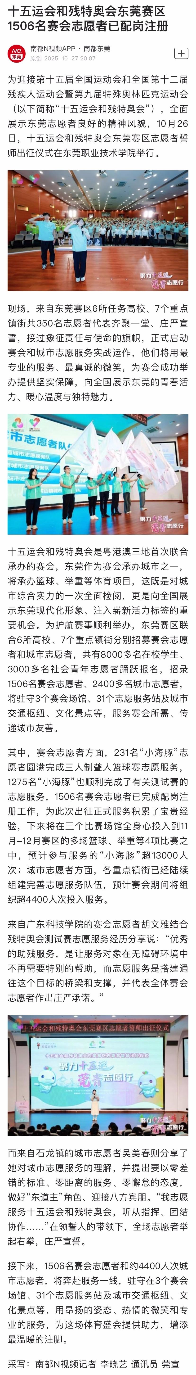 十五运会和残特奥会东莞赛区1506名赛会志愿者已配岗注册