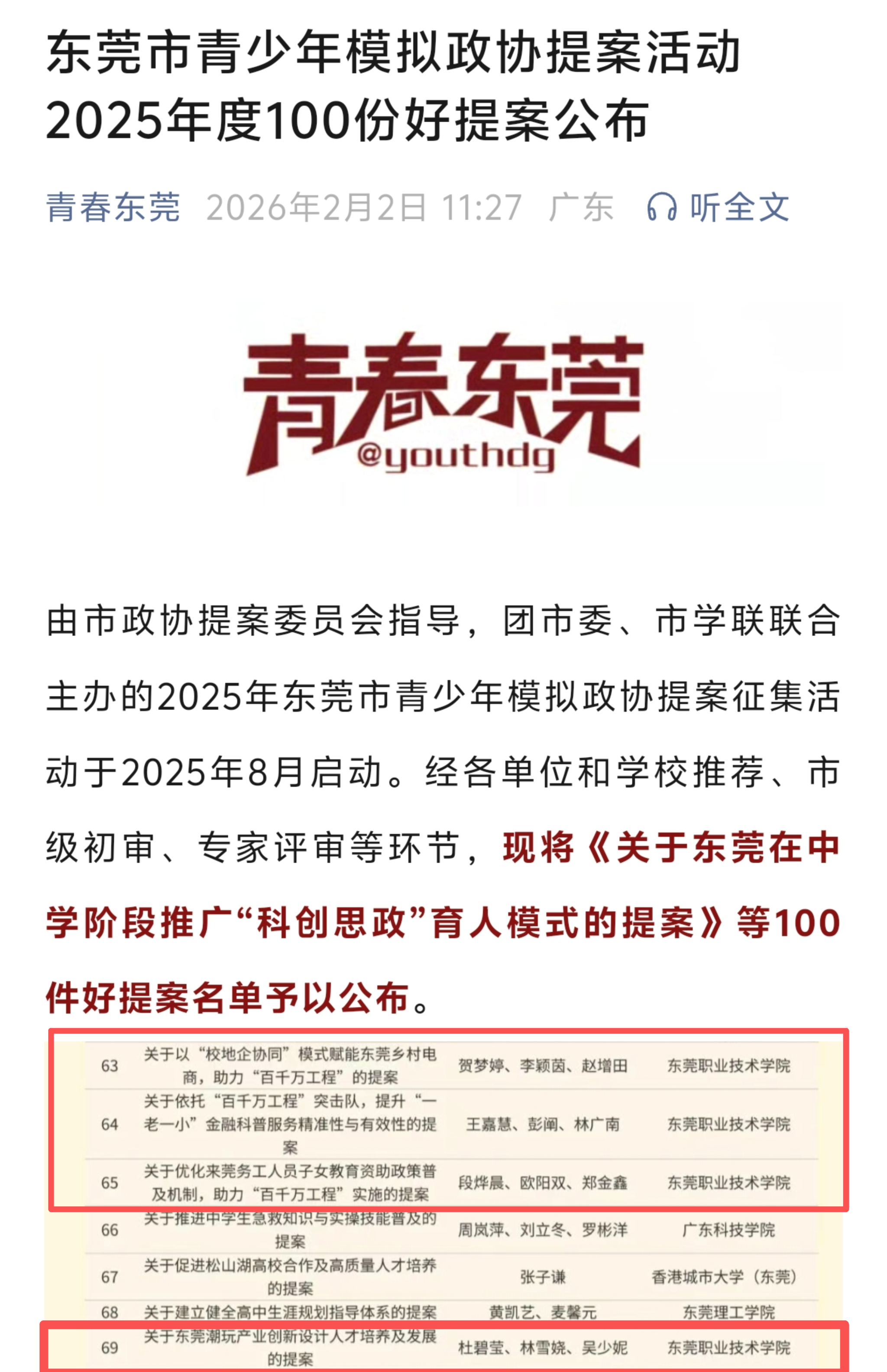 2026年2月2日,由团市委公布的“东莞市青少年模拟政协提案活动2025年度100份好提案”名单中知悉,我校共有4份提案成功入选,分别是商学院汤俊老师指导的《关于以“校地企协同”模式赋能东莞乡村电商,助力“百千万工程”的提案》,商学院赖昊莹、张蕾老师指导的《关于依托“百千万工程”突击队,提升“一老一小”金融科普服务精准性与有效性的提案》,商学院陈耀然、黄丽军老师指导的《关于优化来莞务工人员子女教育资助政策普及机制,助力“百千万工程”实施的提案》和创意设计与传媒学院(筹)吕珊老师指导的《关于东莞潮玩产业创新设计人才培养及发展的提案》。据悉,我校是东莞市获评数量最多的高校。