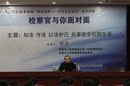 此次讲座特别邀请了东莞市人民检察公诉一科助理检察员、东莞市人民检察院宣讲团成员房洁担任主讲嘉宾。房洁检察员首先以"大学生容易遭遇哪些犯罪"切入讲座的主题,提醒同学们注意财产安全、人身安全,列举分析了"东莞大学生厕所被害案"、"广医分院大三学生打暑假工"、"大学生传销致死他人案"等生动案例,还结合自身的审判经历给同学们讲解了遭遇盗窃、诈骗、抢劫等各种犯罪行为的防范措施及应对方法。