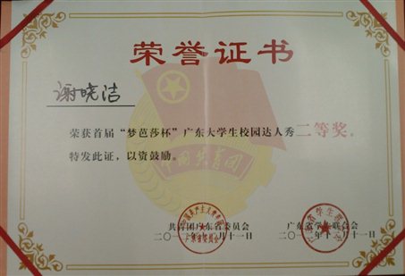 我院参赛选手大学生艺术团声乐队队员谢晓洁同学(艺术设计系园林2010级设计1班)通过稳定、精彩的发挥,在来自全省众多精英选手的激烈竞争中脱颖而出,顺利晋级进入决赛,通过良好的心理素质和不俗的实力,凭借一曲演唱技巧极高的《high歌》获得了首届‘梦芭莎杯’广东大学生校园达人秀大赛银奖的可喜成绩。