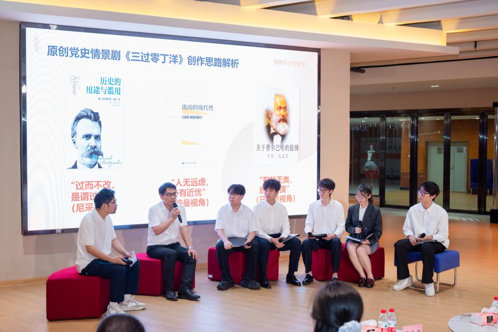 学生代表率先诵读《恰同学少年》片段,以饱满的情感重现了毛泽东等革命青年的热血岁月,引导大家思考历史与现实的联系,当代青年的责任与担当。杨楠老师诵读《日出》片段,用富有感染力的声音展现出剧中的社会百态、人性挣扎;王庆坤、赵泽岚两位老师携手演绎《暗恋桃花源》片段,让观众沉浸于经典的魅力。在对谈分享时,李科老师与三位老师围绕剧本创作背景、角色塑造心得等进行深入交流,为学生们带来深刻的戏剧解读。原创党史情景剧《三过零丁洋》片段的围读将活动推向高潮。学生演员们的精彩诵读,生动展现了那段波澜壮阔的历史。蔡东宝副书记与学生演员在对谈中,分享了作品的创作历程与教育意义,将哲学智慧融入剧本的巧思,引导学生感悟红色革命文化。