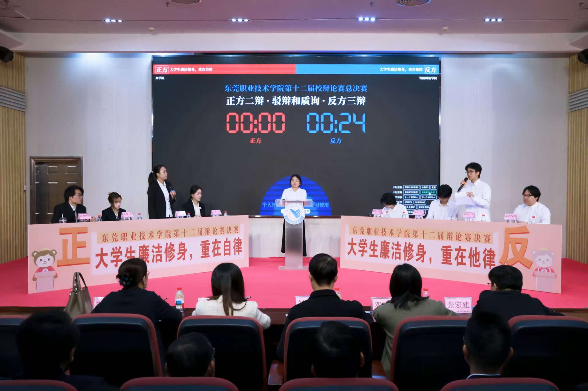 1月14日下午,由学校纪检室、法治办、马克思主义学院、通识学院、校团委、学生会联合主办的东莞职业技术学院第十二届辩论赛决赛顺利举行。校党委副书记、纪委书记蔡东宝,纪检室、学生处、马克思主义学院、通识学院相关负责同志出席,机关党总支书记刘明、马克思主义学院副院长罗美琪、纪检室邓雨鸣,通识学院语文教研室陈玉萍、张宏建担任本次决赛评委。