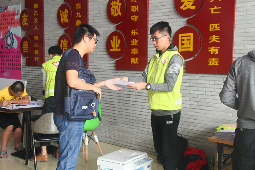 早上8:30,志愿者们准时集合在活动中心与负责人一起筹备物资,分配好岗位职责后,活动于9点准时开始。随着下课时间的到来,同学们陆陆续续前来咨询如何办理志愿者证,志愿者们耐心地指导和协助同学们填表办理,帮忙复印办理所需资料。