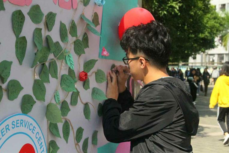 活动期间,志愿者们用热情与活力向路过摊位的同学宣传我们的感恩节活动,号召同学们勇敢表达自己,借这个机会,向父母,老师,同学和身边那些可爱的人表达自己的感激之情。在拍感恩视频中,同学们都真情流露,对着镜头勇敢地表达出自己心中的爱,时刻温暖着我们。为了给每一个有感恩之心的人创造一个感恩的机会,志愿者收集了同学们写有祝福语的纸花送给为一直为我们默默付出的保安叔叔和宿管阿姨。此外同学们也纷纷积极参与感恩小游戏,并在分发的便利贴上写下自己的祝福语,一笔一划写下的言语虽短,可是代表的意义却很非凡,留言墙很快就贴满了同学们发自内心的深切祝福。在明年的1月2日或11月11日也会收到来自朋友的感恩漂流瓶。