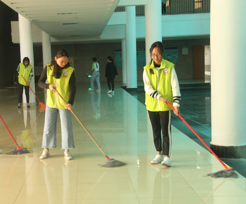 下午14点15分,志愿者们提前到达活动中心集合做好准备工作。14点30分,清洁活动准时开始。同学们在小组长带领下拿到各自的工具,来到各自的岗位进行清扫。本次清扫范围包括活动中心一二楼、小剧场。志愿者们认真仔细地扫去地上的垃圾,擦去玻璃上的灰尘。大家不怕脏不嫌累,工作积极负责,互相配合完成清洁任务。通过同学们一个多小时的努力工作,活动中心的环境焕然一新。