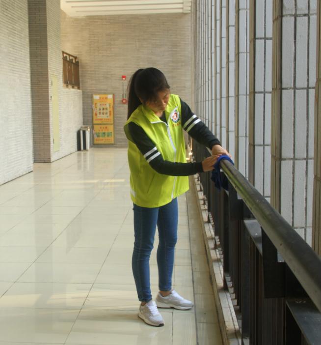 志愿者擦栏杆中