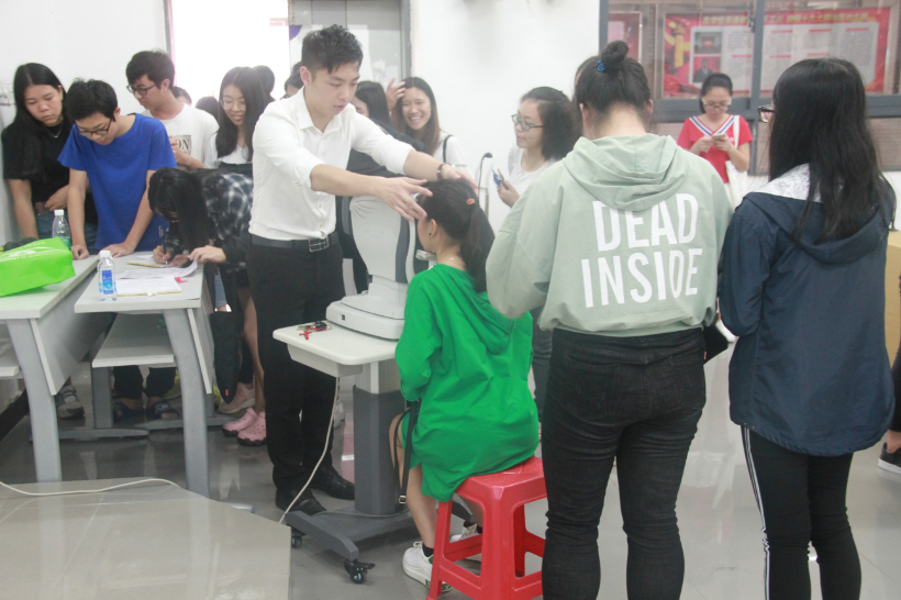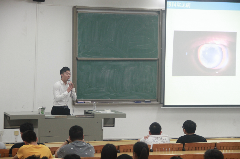 讲座开始前,现场座无虚席,志愿者们认真维持秩序并协助彭老师。他以“您的眼睛,我来关心”为主题开始介绍,以PPT的形式普及眼科有哪些常见病、屈光不正、高度近视眼的并发症与危害、接着讲解了近视的几种矫正方法,播放近视眼手术视频,彭老师以幽默风趣的说话方式获得了同学们的一致好评。此次讲座过程十分顺利,不仅如此,讲座结束后,现场还提供了验眼环节。