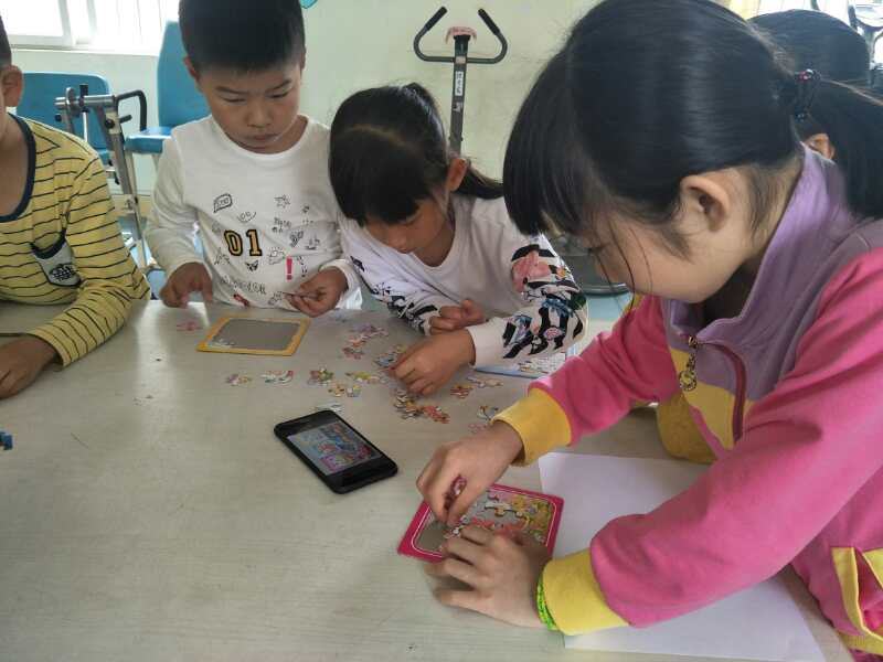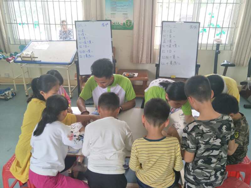本次的学堂教学,我们从“听”“视”“动”角度出发,结合一二年级儿童心理特点,通过游戏,自我暗示、干扰法、静坐法等提升他们的专注力,帮忙他们更好地学习。首先,第一个游戏是让孩子们说出混合颜料的颜色;第二个游戏是拿拼图给孩子们拼看谁拼准确和快;第三个游戏是让孩子们在图片上找到自己需要的数字和符号列出一条数学式子并求出答案。活动过程中,志愿者们协助孩子们游戏的完成,每一位孩子都是专注地完成每一个游戏,回答问题也是“快、齐、准”。