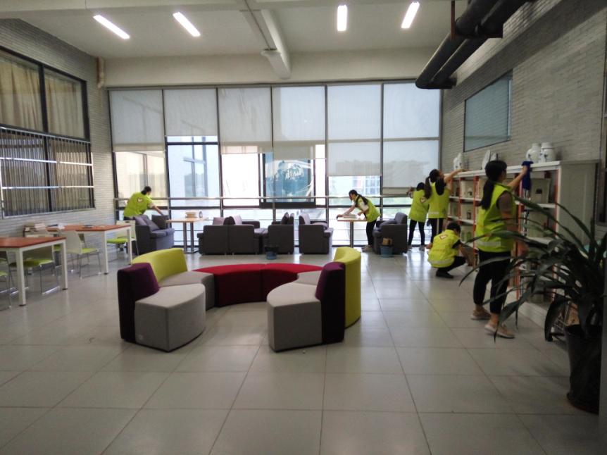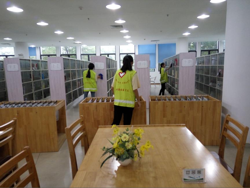 当天下午两点三十分,志愿者们在图书馆门前集合完毕,在负责人的指挥下分成十个小组,不同小组负责不同楼层以及同一楼层的不同区域,分配完成后,志愿者在老师的带领下安静的进入图书馆,到达各自需要打扫的区域,并在那领取了简单的清洁工具,为了不打扰馆内同学的学习,进行清洁活动时要求尽可能的保持安静,志愿者擦拭书架、整理书籍、清洁桌椅和地板等等,图书馆里充满了志愿者们忙碌的身影,书库里的书架和桌椅等在志愿者的辛勤劳作下焕然一新。
