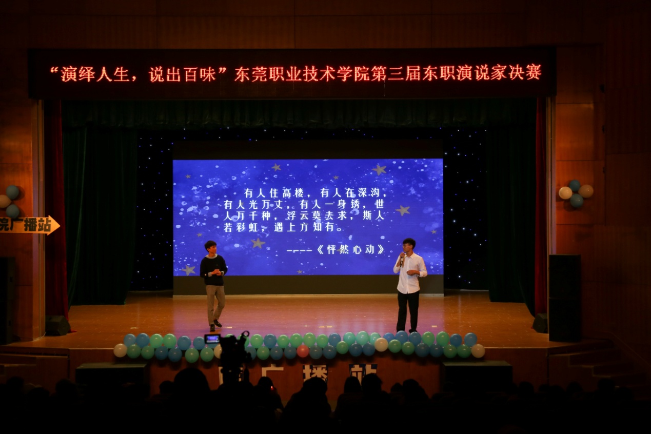2017年12月14日晚19点30分,由院团委主办,院广播站承办的“演绎人生,说出百味”第三届东职演说家决赛在梦想剧场举行。